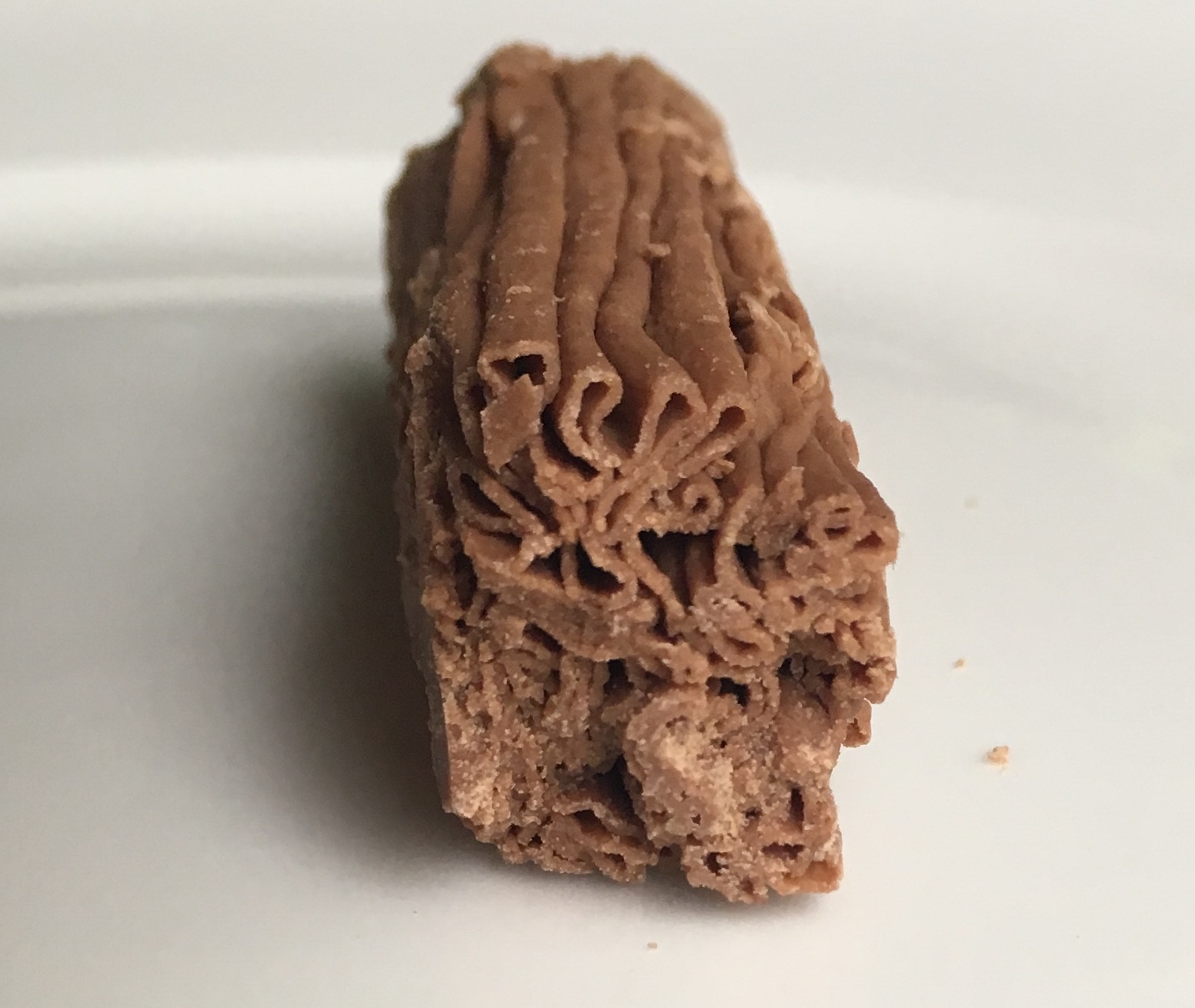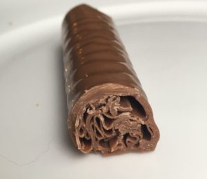 We found flake to have a very pleasant texture, the density of something light like the Aero bar but with different distribution of space. The chocolate itself is very creamy and not too sweet. Because of it’s creaminess, pockets of air in the chocolate help distribute the richness of the chocolate. Personally, I always find Cadbury milk chocolate to be too heavy for me, so this is the perfect presentation for Cadbury. One thing about flake that isn’t perfect is that no matter how careful I try to eat this, I look like cookie monster. There’s just no way around it’s flaking off into particles all over the place. I wonder if “crumble” might have been a more appropriate name.